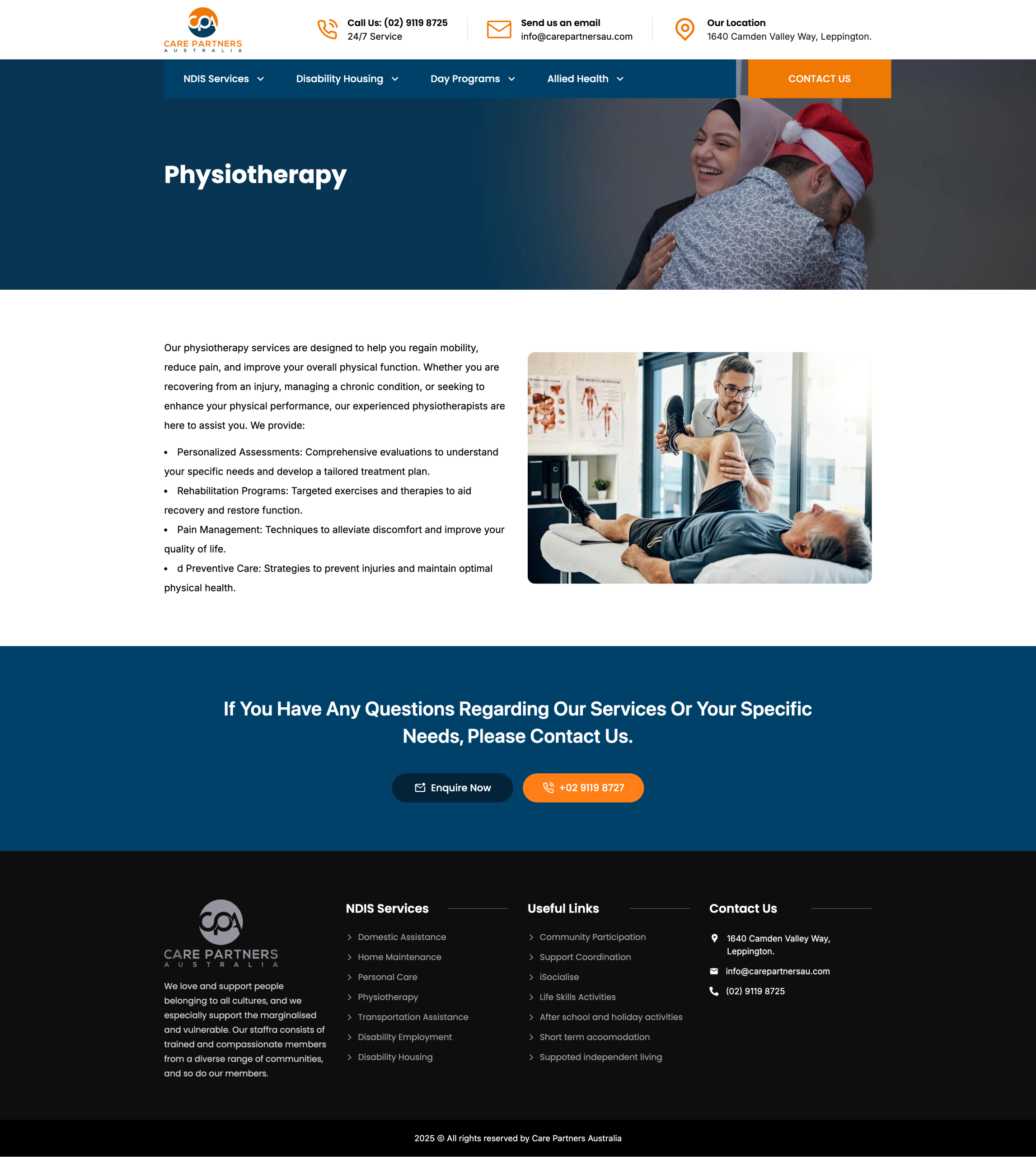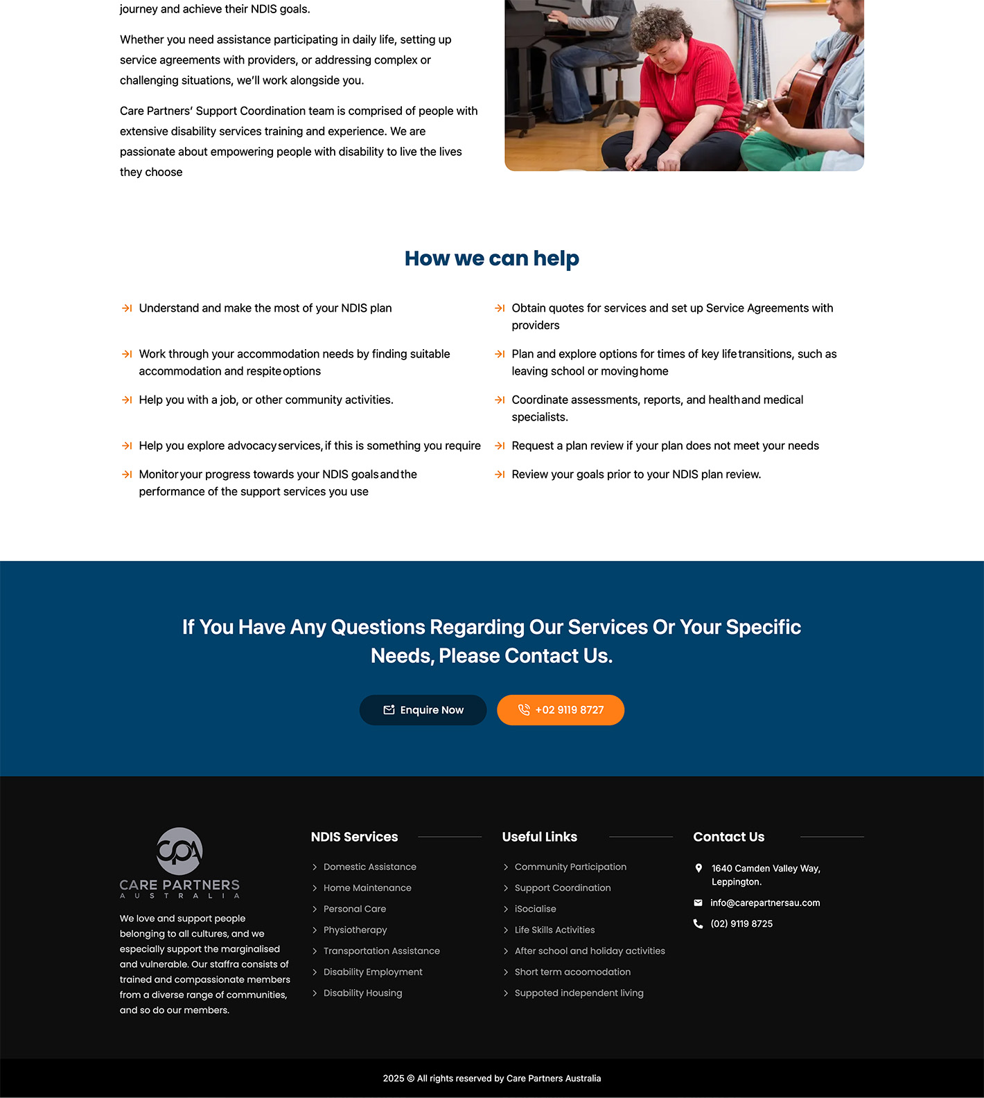 We began by refining Care Partners Australia’s brand through a refreshed logo and a clearer visual direction. We then rebuilt the website from the ground up using a fully custom design, focusing on clarity, accessibility, and ease of use. Content and page structure were simplified to guide users naturally toward key information and enquiries, while layouts were designed to feel calm, inclusive, and professional. Performance and responsiveness were prioritised to ensure a smooth experience across mobile and desktop, and the site was structured to be easy for internal teams to manage and update.